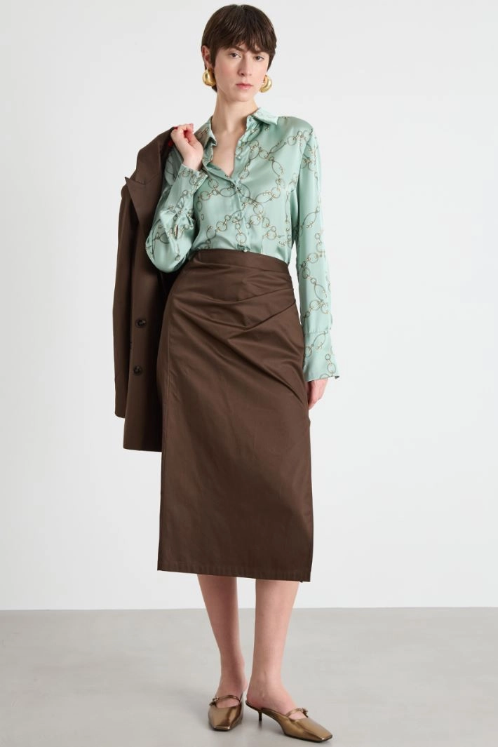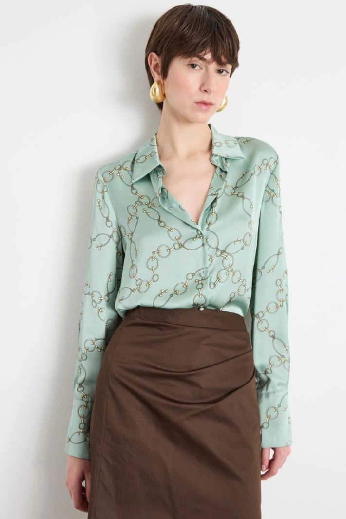 Flowing blouse in printed satin, featuring a point collar, long cuffed sleeves and side slits at the hem. Button fastening.