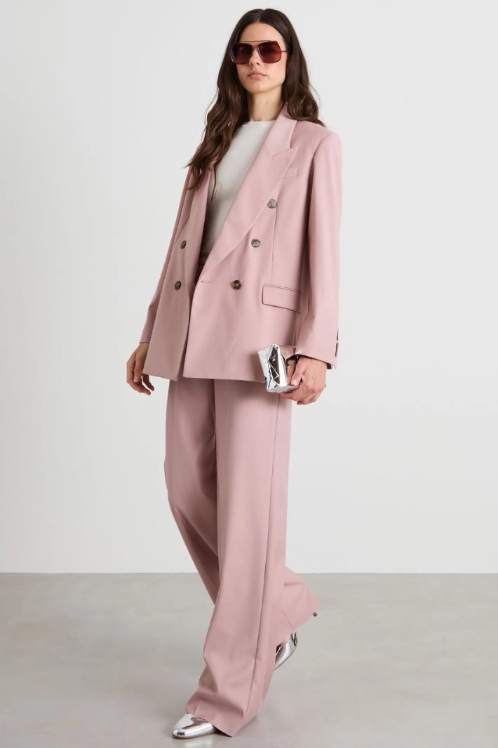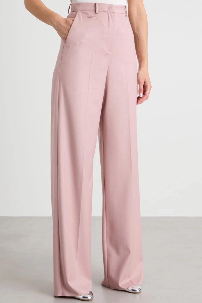 Palazzo trousers in stretch viscose-blend gabardine, with belt loops at the waist, double-welt fake pocket and French pockets in the front, double-welt pockets with button on the back and pressed crease ironed along the length. Hidden fastening with zip, button and hook.