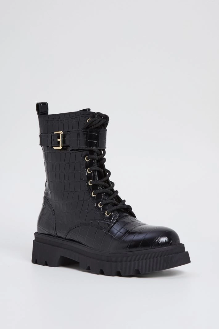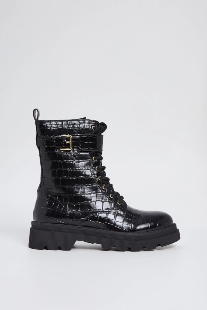 Combat boots in genuine crocodile-print leather with a shiny finish, with adjustable ankle strap detail and metal buckle. Lace-up fastening and zip on the inside. Rubber trekking sole.