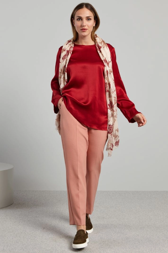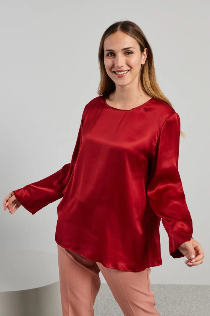 Fluid blouse in pure washed silk satin, with round neckline and long sleeves with vents at the hem.