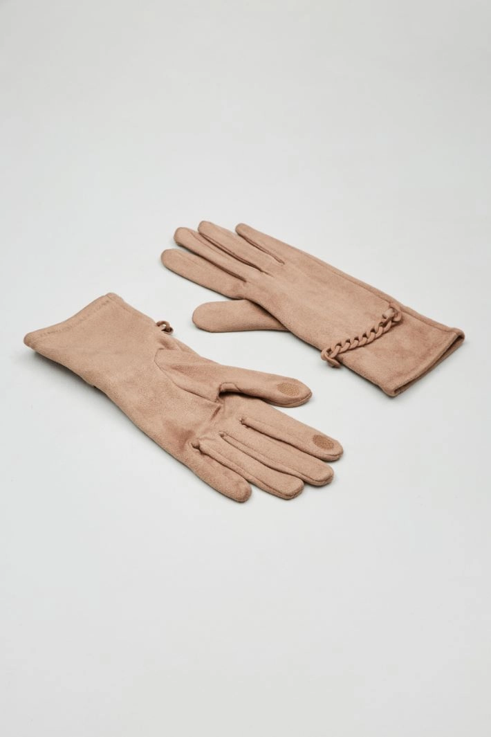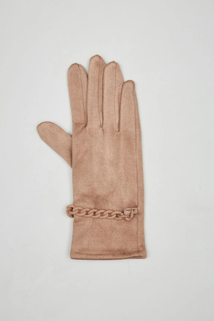 Gloves in suede-effect cotton blend jersey, with resin chain motif and plush interior.