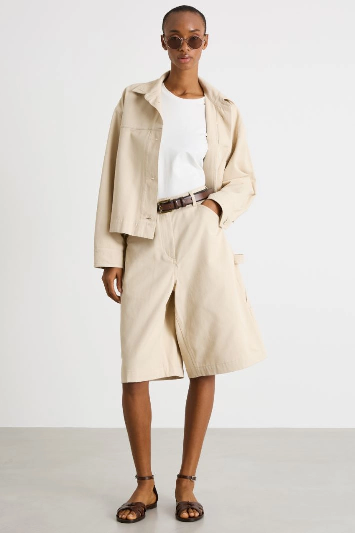 Boxy-fit jacket crafted in pure cotton canvas, with a shirt collar, long dropped-shoulder sleeves with buttoned cuffs, a patch pocket on the chest, a top-stitched yoke on the front and back, and side vents. Button fastening.