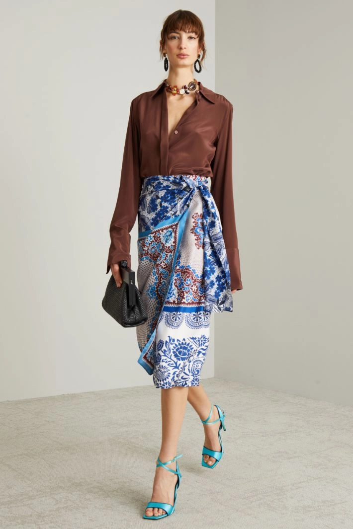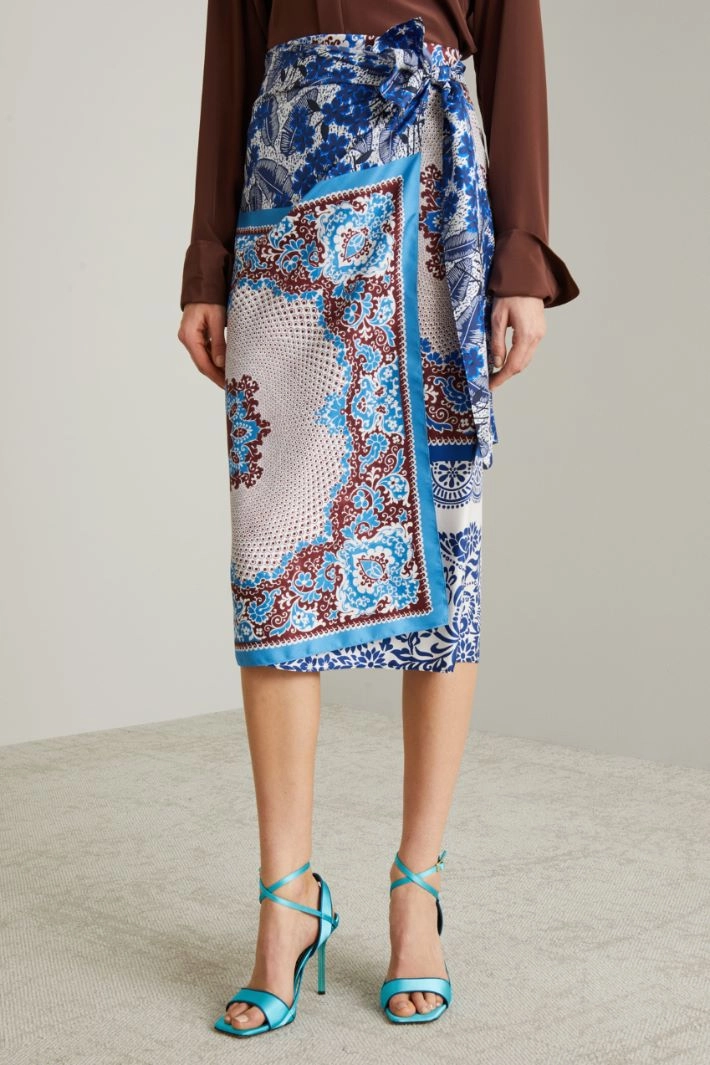 Straight-fit pareo-style skirt in pure silk twill with an all-over print, with a sash fastening on the side.
