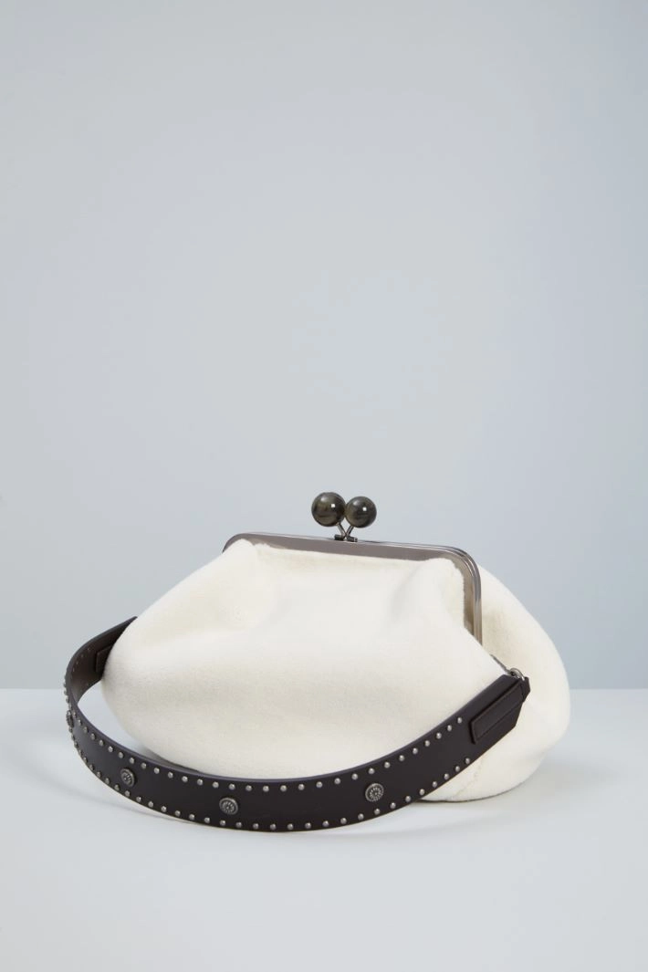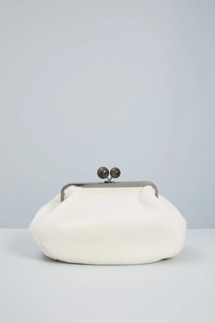 Clutch in fur-effect wool and cotton blend fabric, with removable handle and chain shoulder strap. Lined interior with pocket and snap closure with resin balls.