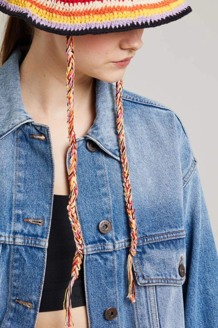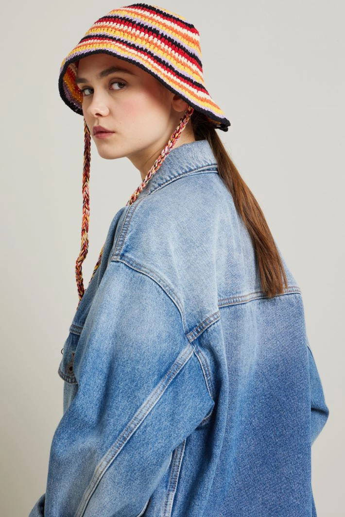 Hat in crochet cotton, with shapeable brim and laces to tie under the chin.
