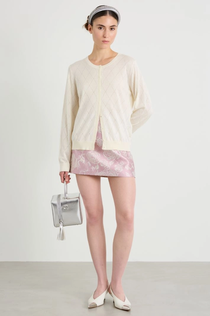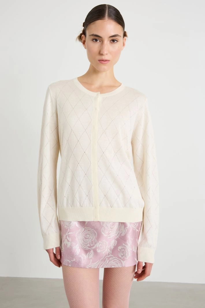 Regular-fit cardigan in silk and wool yarn, with diamond-shaped openwork, rhinestone appliques, crew neck, long sleeves and ribbed trim. Hidden button fastening.
