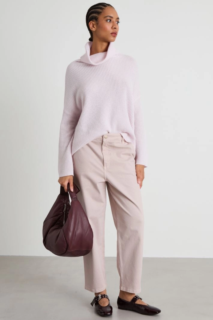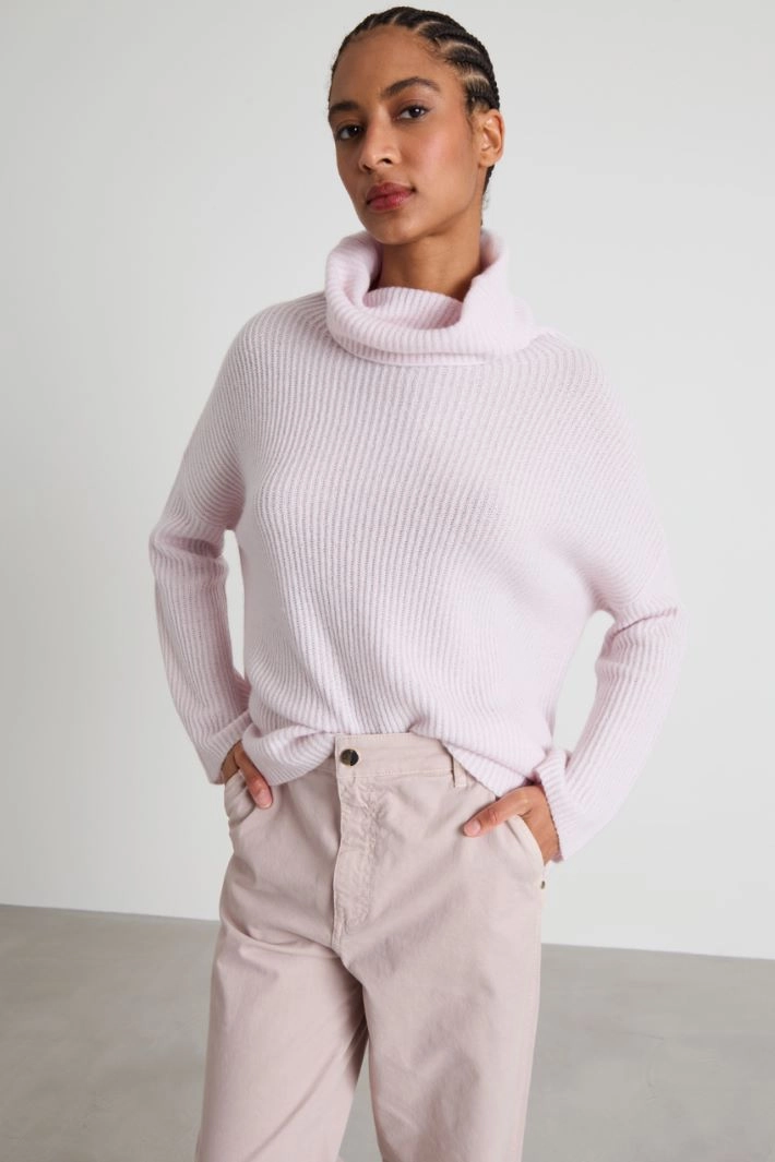 Straight-cut sweater in pure cashmere yarn, with a high neck and long dropped sleeves.