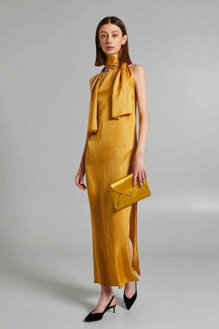 Long sleeveless fluid dress in pure viscose satin, with scarf collar and wide side slit. Invisible zip fastening on the side.