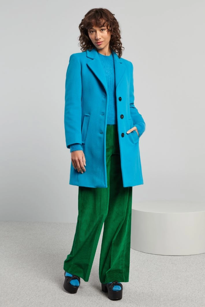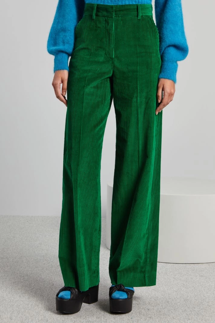 Loose-fit palazzo trousers in pure cotton corduroy, with belt loops at the waist, slant pockets on the front and welt pockets with button on the back. Hidden fastening with zip, button and hook.