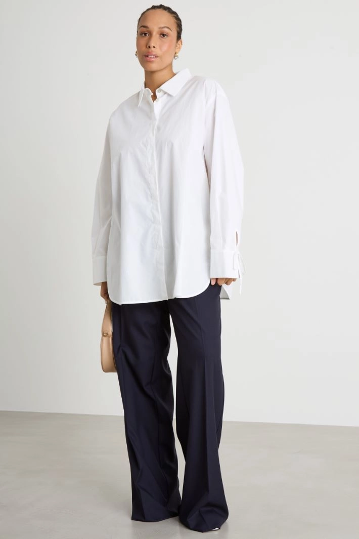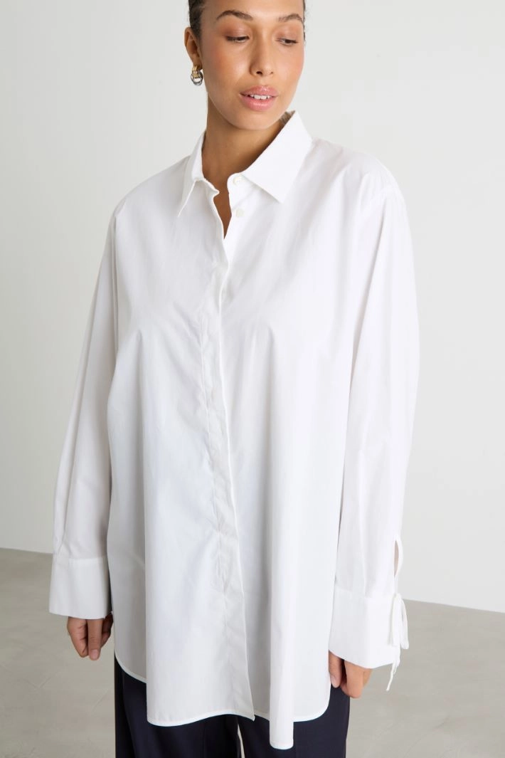A-line tunic in cotton poplin, with a shirt collar, long sleeves with tie detailing, a yoke with a box pleat on the back and a rounded hem with side slits. Button fastening.