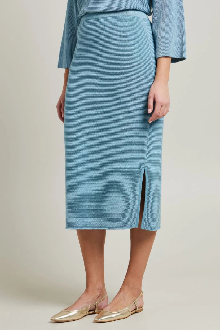 Straight-fit skirt in lamé cotton blend knit, with elastic waistband and side slit at the bottom. Lined.
