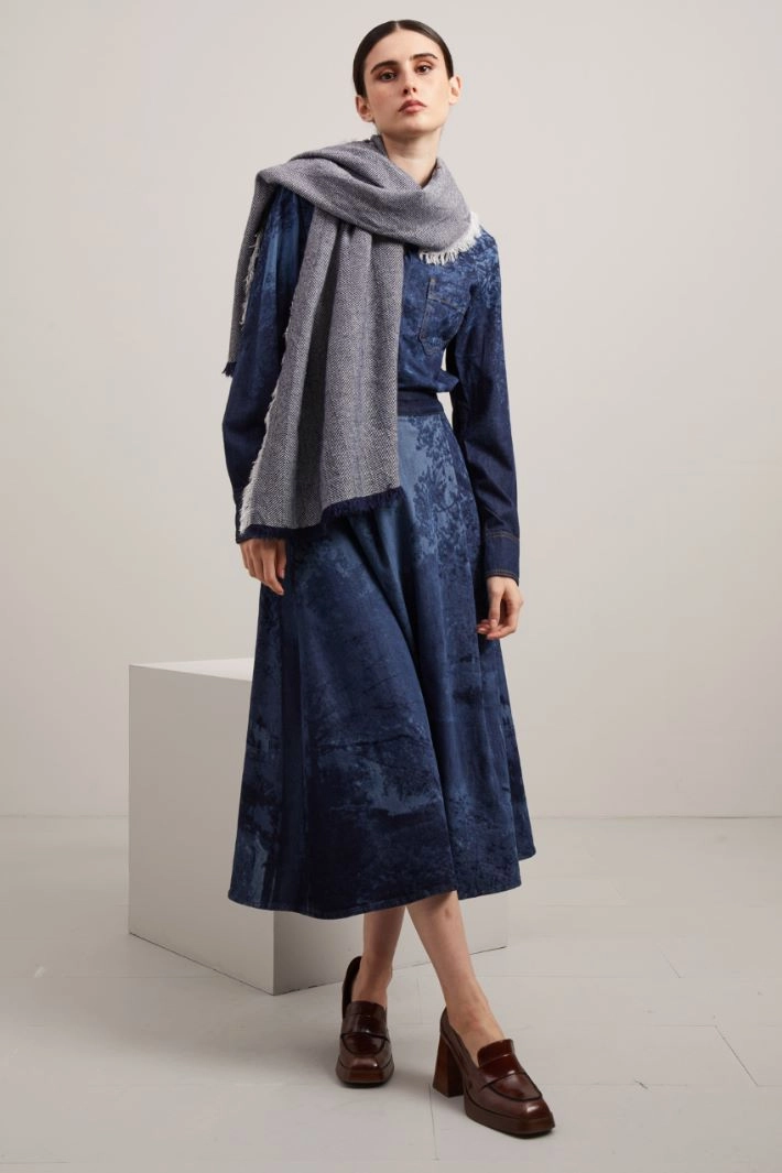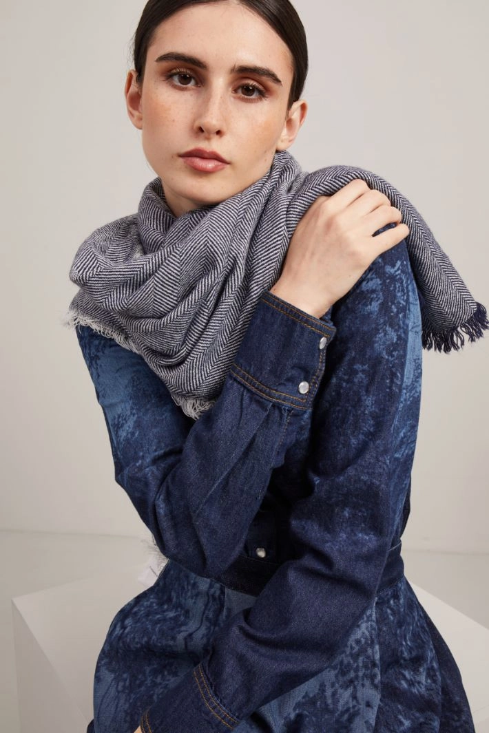 Stole in yarn-dyed viscose wool and alpaca blend yarn with fringed edges.